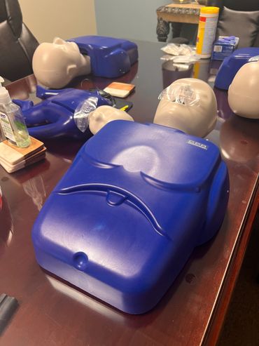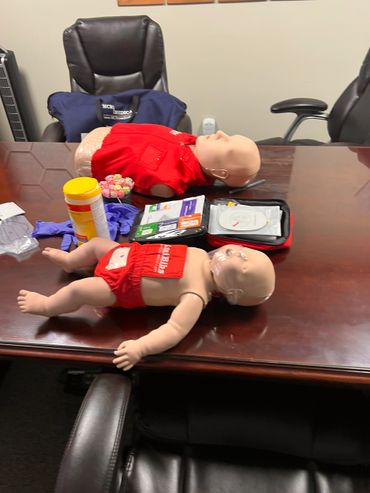 Two CPR training mannequins, adult and infant, on a table in an office.